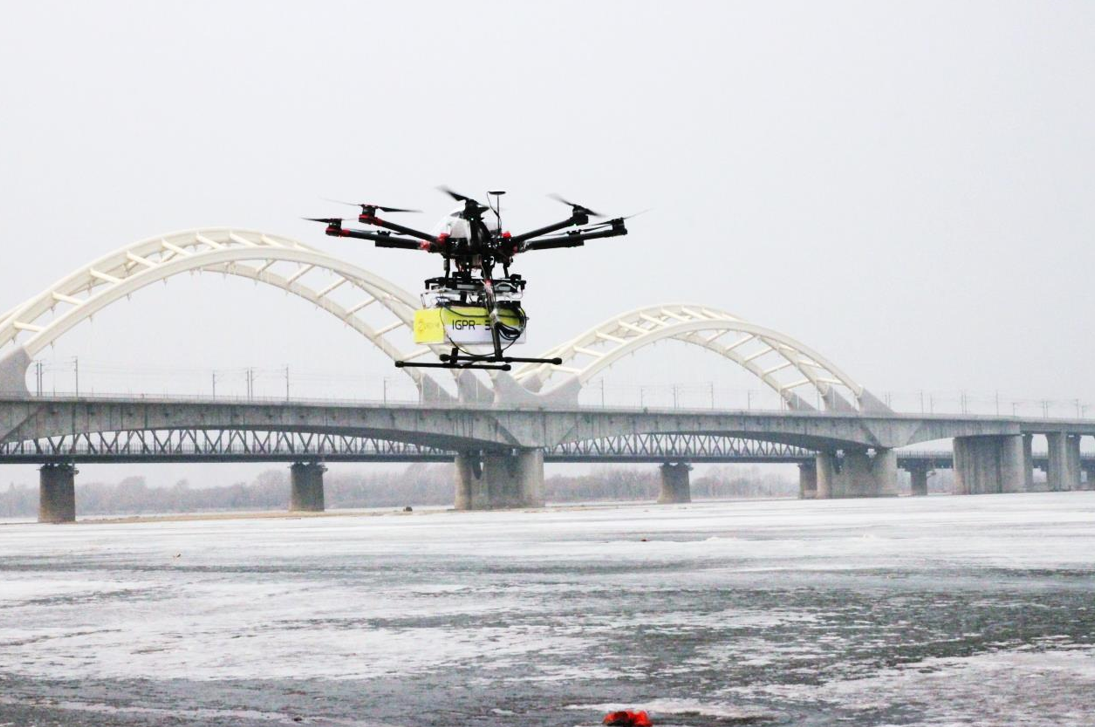 大連中睿科技發(fā)展有限公司歷時一年研發(fā)的IGPR-30無人機飛航測冰雷達,2016年初在松花江哈爾濱江段試驗成功,獲得了清晰準確的連續(xù)冰層雷達圖像。飛航測冰現(xiàn)場,系統(tǒng)飛行姿態(tài)穩(wěn)定,雷達探測成像清晰,操控靈敏,可以10-15m/s速度快速連續(xù)施測,可實時獲取高精度的河流冰層連續(xù)厚度數(shù)據(jù)。IGPR-30無人機飛航測冰雷達集成了RTK精確定位系統(tǒng),可準確測量記錄飛航測線軌跡,并與GIS地圖融合。IGPR-30無人機飛航測冰雷達是河流冰情觀測的創(chuàng)新性技術設備,為河流冰情快速精準測量和河流凌汛應急探測提供了先進的高效率的技術手段。