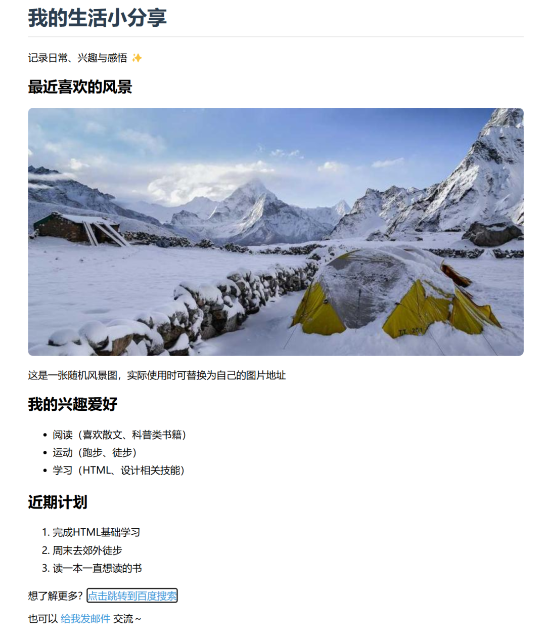 <!DOCTYPE html> <html lang="zh-CN"> <head> <meta charset="UTF-8"> <meta name="viewport" content="width=device-width, initial-scale=1.0"> <title>我的生活小分享</title> <style> /* 页面整体样式 */ body { font-family: "微软雅黑", sans-serif; max-width: 800px; margin: 0 auto; padding: 20px; line-height: 1.6; color: #333; } /* 标题样式 */ h1 { font-size: 28px; color: #222; margin-bottom: 10px; } h2 { font-size: 22px; color: #222; margin: 30px 0 15px; border-bottom: none; } /* 副标题样式 */ .subtitle { color: #666; font-size: 16px; margin-bottom: 20px; } /* 图片样式 */ .scenery-img { width: 100%; height: auto; margin: 10px 0; border: none; } /* 图片说明文字 */ .img-desc { color: #666; font-size: 14px; margin-bottom: 20px; } /* 无序列表(兴趣爱好) */ ul { list-style-type: disc; padding-left: 20px; margin: 10px 0; } ul li { margin: 8px 0; } /* 有序列表(近期计划) */ ol { list-style-type: decimal; padding-left: 20px; margin: 10px 0; } ol li { margin: 8px 0; } /* 链接样式 */ a { color: #0066cc; text-decoration: none; border-bottom: 1px solid #0066cc; } a:hover { color: #004999; border-bottom-color: #004999; } /* 底部文字 */ .mail-text { margin-top: 10px; color: #333; font-size: 16px; } </style> </head> <body> <!-- 主标题 --> <h1>我的生活小分享</h1> <p class="subtitle">记录日常、兴趣与感悟 ⭐</p> <!-- 最近喜欢的风景 --> <h2>最近喜欢的风景</h2> <img src="https://picsum.photos/id/1036/800/400" alt="自然风景图" class="scenery-img"> <p class="img-desc">这是一张随机风景图,实际使用时可替换为自己的图片地址</p> <!-- 我的兴趣爱好 --> <h2>我的兴趣爱好</h2> <ul> <li>阅读(喜欢散文、科普类书籍)</li> <li>运动(跑步、徒步)</li> <li>学习(HTML、设计相关技能)</li> </ul> <!-- 近期计划 --> <h2>近期计划</h2> <ol> <li>完成HTML基础学习</li> <li>周末去郊外徒步</li> <li>读一本一直想读的书</li> </ol> <!-- 链接与邮件 --> <p>想了解更多?<a target="_blank">点击跳转到百度搜索</a></p> <p class="mail-text">也可以 给我发邮件 交流~</p> </body> </html>以上代码因直接复制会导致语法错误以及格式混乱,图片的方法作为参照加以借鉴,具体使用方法放在末尾了(直接复制即可)